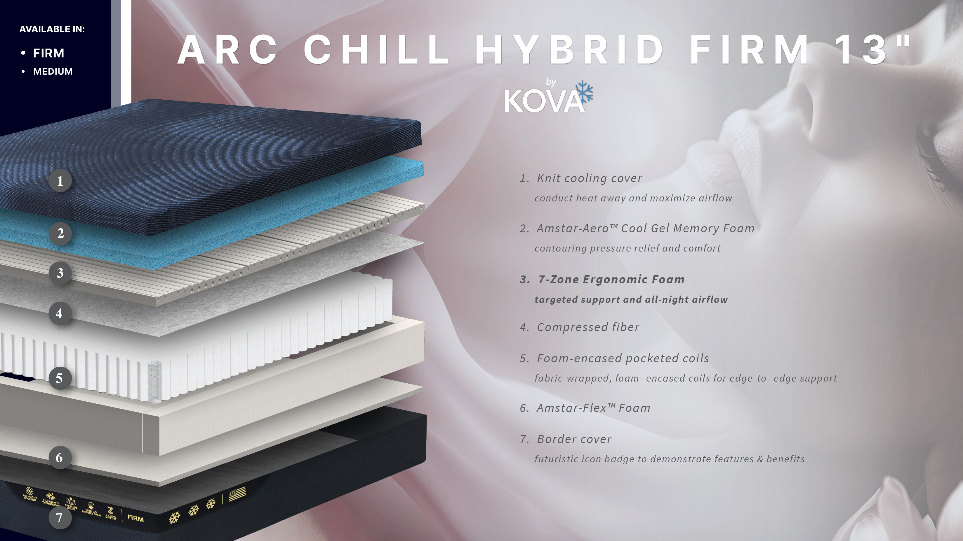 The KOVA Arc Chill™ Hybrid Firm is a 13" smooth-top mattress designed for sleepers who need firmer support without sacrificing cool comfort. Made with advanced materials like Amstar-Aero™ gel memory foam and 7-Zone Ergonomic Foam, this mattress delivers pressure relief, spinal alignment, and airflow that lasts all night.